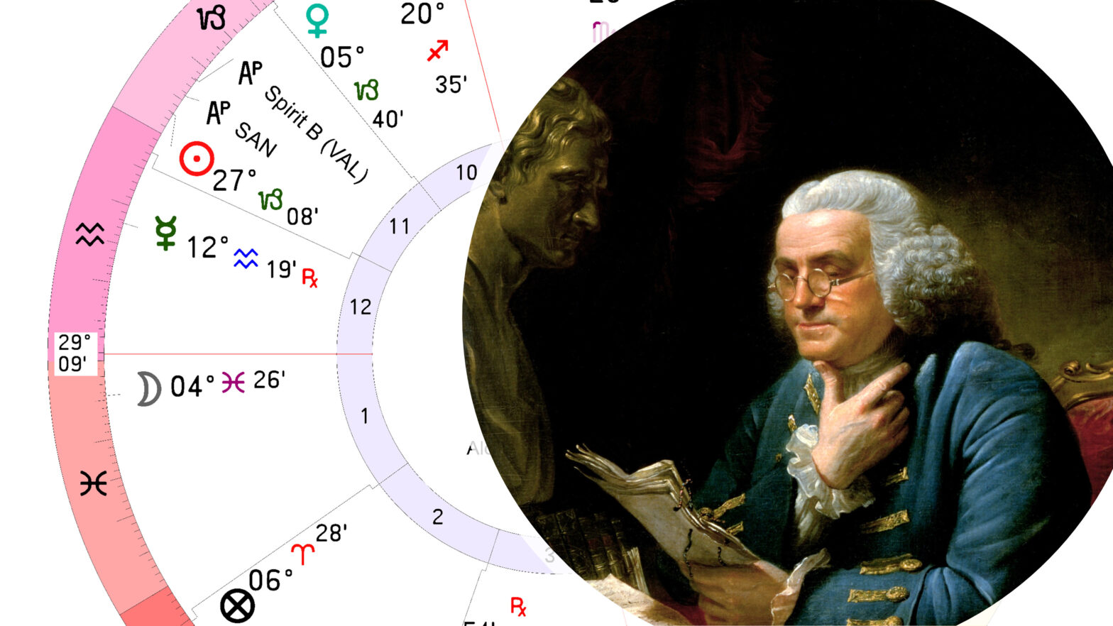 Conclusion: If the L.Spirit is in Capricorn, then the corresponding Ascendant range is 6AQ45 – 7PI29. Based on Franklin’s intellectual curiosity, I favor Aquarius over Pisces as the Ascendant.