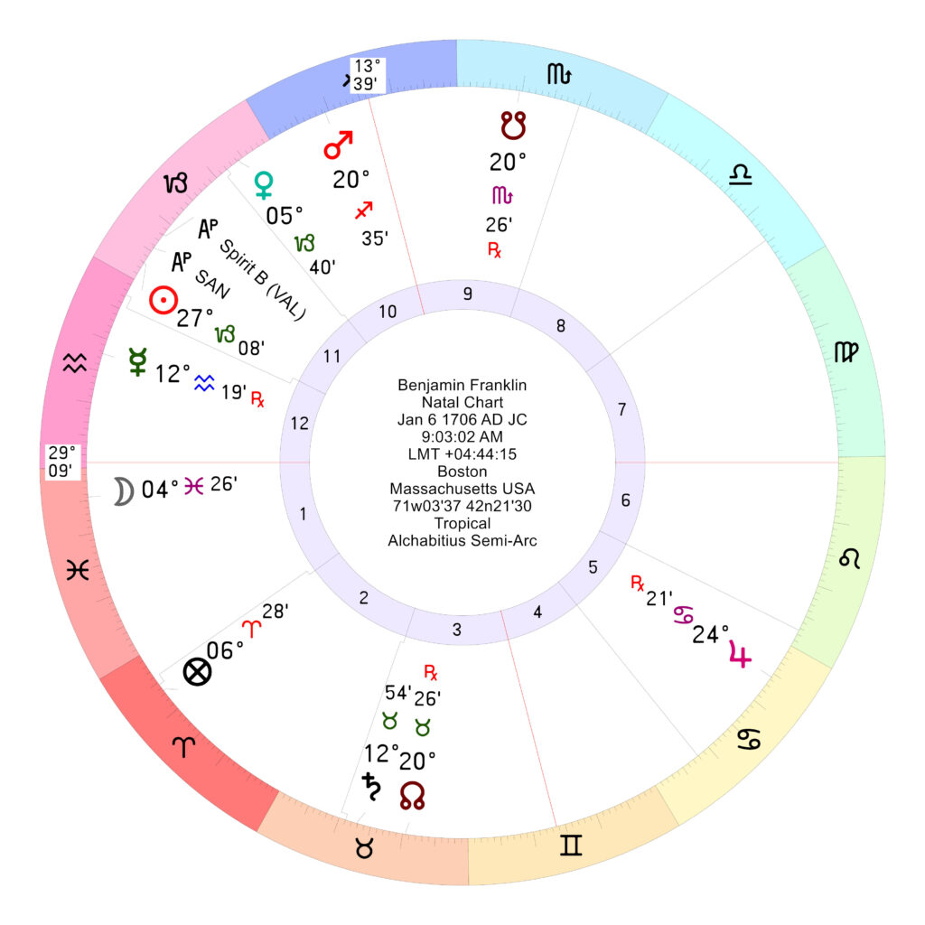In A Rectification Manual (2008), I proposed a trial rectification of 1:43:14 PM with an Ascendant of 16GE11’19”. Part of the motivation for that rectification was choice of Gemini rising as a delineation match to Franklin’s intellectual curiosity. In this revised rectification, I am motivated more by Zodiacal Releasing from Spirit to choose a time of 9:03:02 AM with an Ascendant of 29AQ09’55”. In the 2008 trial rectification Mercury rules the Ascendant sign; in the revised 2020 rectification, Mercury/Aquarius-rx influences the Ascendant sign by position.